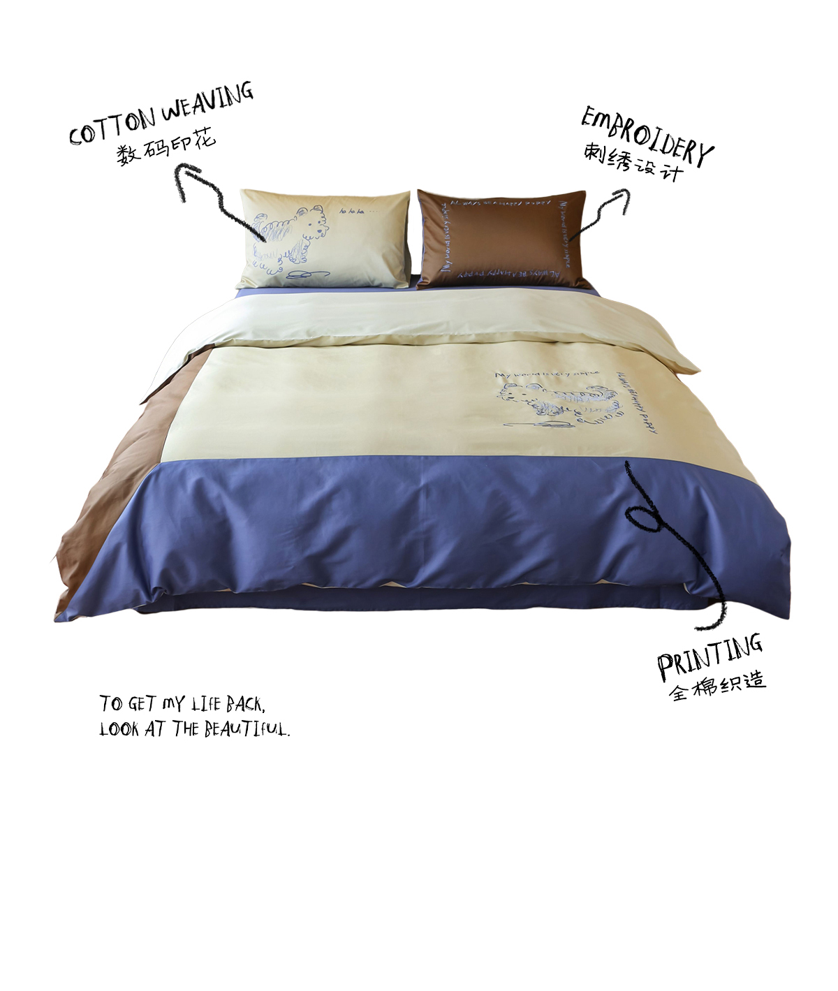 花时间生活100支全棉四件套双股贡缎刺绣长绒棉撞色拼接印花床品的描述