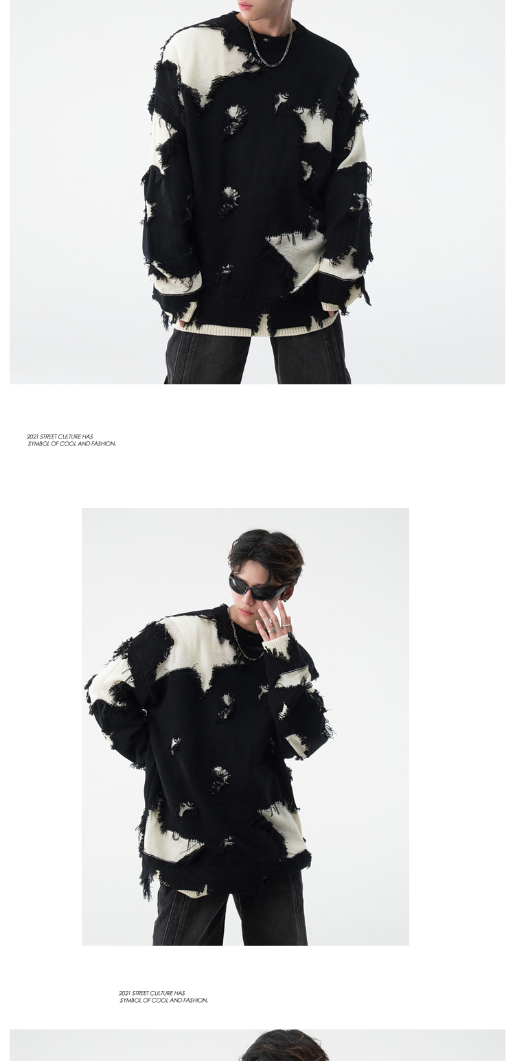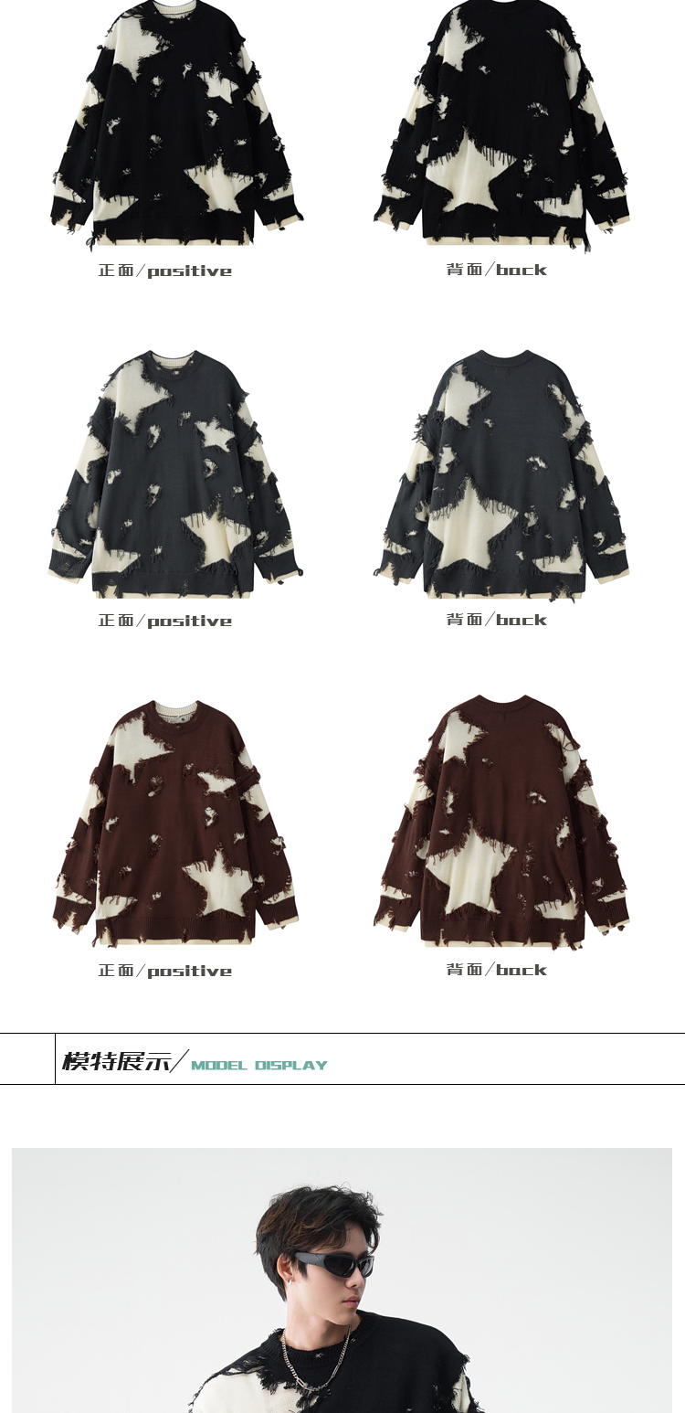 BOYUE帛跃星星破洞毛衣美式小众毛边破烂风男女时尚重工针织衫潮的描述